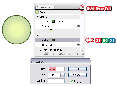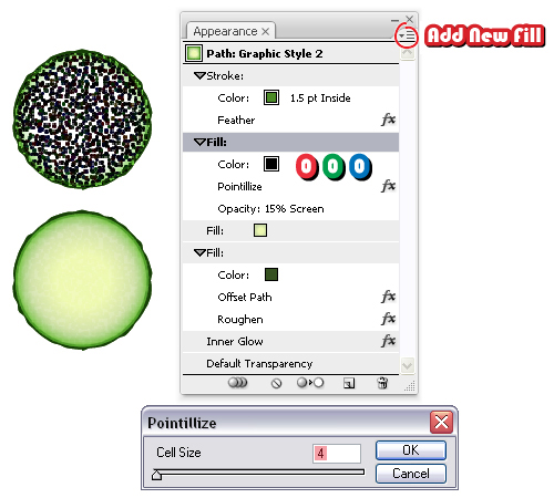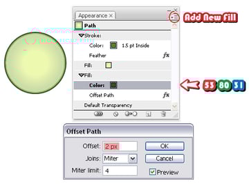 From the Appearance Panel, open the fly-out menu and choose Add New Fill. Change the fill color to the one indicated and drag the fill under the first one. Now having this second fill selected go to Effect > Path > Offset Path and apply a 2 px Offset value to obtain the peel around the cucumber slice.