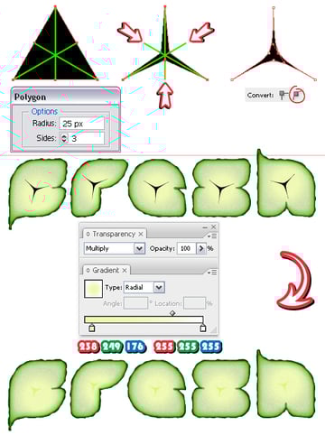 Multiply the resulting shape and place one on each letter. Lightly rotate them so they don't look identical. Fill these shapes with the yellow to white radial gradient shown and change the Blending mode to Multiply because this way white becomes transparent.