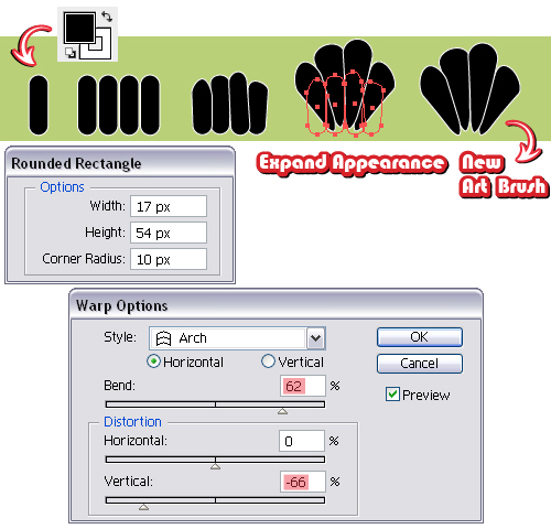 Take the Rounded Rectangle Tool and click on your working area to open the window then enter the numbers shown. Select for this small rectangle a black fill and a 1 pt white Stroke then multiply it and arrange four in a row. Now take the Direct Selection Tool (A) and move some of the points to distort them a bit and also rotate them lightly. Group these four shapes then go to Effect > Warp and apply the Arch effect. Choose Expand Appearance from the Object menu then drag the group into the Brushes Panel and select New Art Brush.