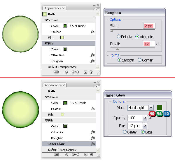 Also for the second fill apply the Roughen effect that you can find in the Effect menu under Stylize. Next go back to Effect > Stylize and this time apply the Inner Glow effect (not only for the second fill) using the green color shown.