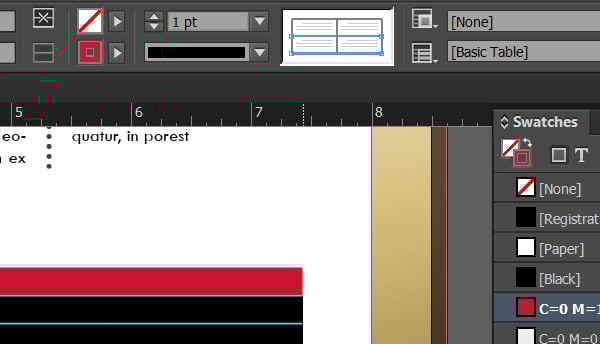 Next we'll change the stroke colors for the rows by Highlighting the bottom 3 rows like we did for the top row. Adjust the strokes to the setting seen below with the same red color: C=0 M=100 Y=80 K=15. Notice only the middle line is selected in Blue. You can click each Stroke to Activate it and click again to Deactivate it. This allows you ultimate flexibility in designing the table you want as well as the colors of your strokes. If you notice any unwanted strokes, you can always Highlight the Column and/or Row and adjust the Stroke color, width, etc in the Swatches panel and the Properties panel. To add a Bottom Stroke to your table, make sure it is Highlighted along with the Middle Stroke.