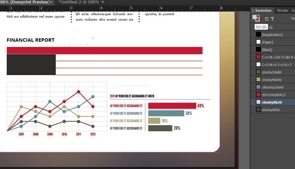 Highlight the first row by clicking and dragging all the way across the 4 columns. Once you have the first row selected, fill it with a bright red: C=0 M=100 Y=80 K=15 from the Swatches panel.