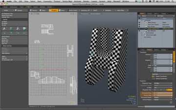One of the most important aspects of good UV mapping is ensuring that the different sections of your map all utilise the same amount of UV space - something that's much easier to understand if I demonstrate! First, import a checkerboard texture into your scene, by switching to the Shader tab, rolling down the Render section and clicking Add Layer > Image Map. The image should automatically display on your object using your newly created UV map for it's projection, however if it's not using the right map you can go to the Texture Locator section of the image's properties, and select your map from the drop down.