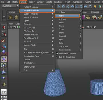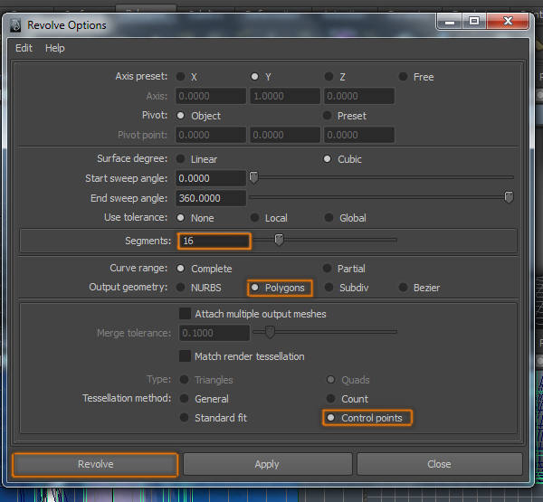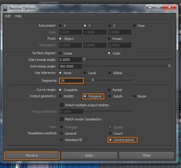 Inside the revolve option box, increase the segments to 16, make the output geometry “Polygons” and the “Tessellation Method” to control points. (When need the object to be a made of polygons instead of NURBS because nDynamics only works with polygons)