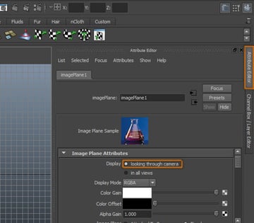 If you go to the perspective view you will see the image as a plane, but we don´t want the image to be displayed in any other view that is not the front view. To hide the image go to its Attribute Editor, and check the “looking through camera” option.