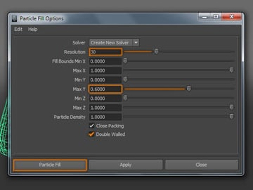 A window with nParticles options will show up, increase the resolution to 30, and the “Max Y” to .6, make sure “Double Walled” option is checked. (the “Max Y” option determines how full the container is, note that the water will compress, so this value will be at least half).