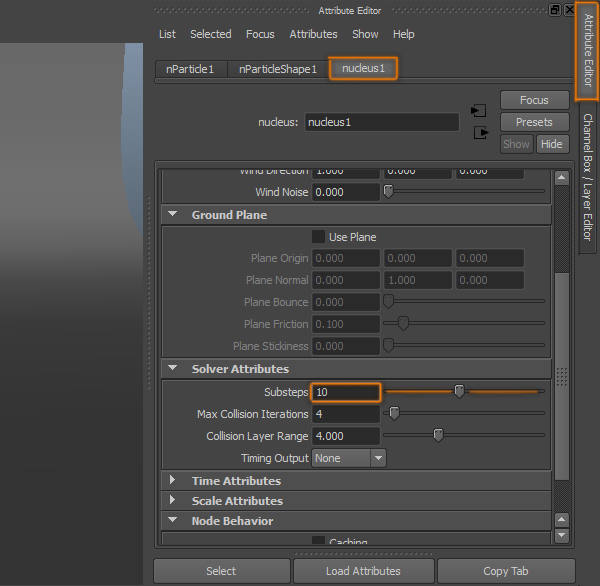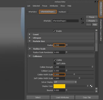 Select the nParticle system, go to its Attribute editor, increase the “Radius” to .340 (this will vary depending on the size of your scene), under the “Collisions” section, change the “Collide Width Scale” to 0.600, this will compress the particles creating more realistic water.