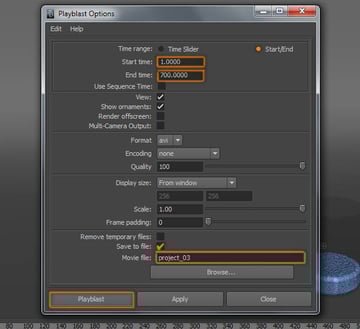 Select the time range where your animation takes place, and where do you want to save the file. Click on playblast.