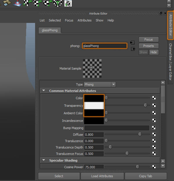 Open the Attribute editor of the phong material, add a name to it, change the color to black, the transparency to a white grey and the Ambient Color to black.