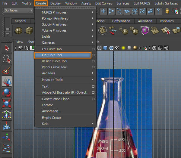 While looking through the front view, go to “Create > EP Curve Tool”.