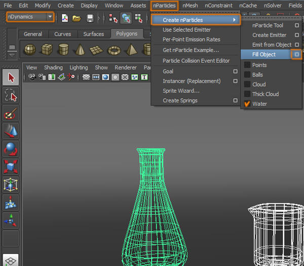 At the “nDynamics” menu, go to “nParticles > Create nParticles > Fill Object (option box)” make sure “Water” is selected”.