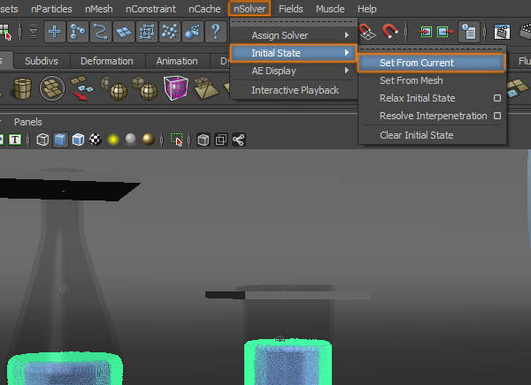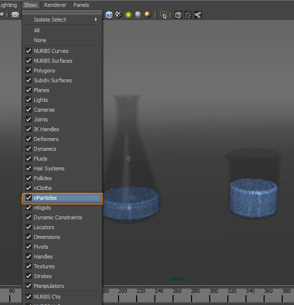 At the view menu, go to “Show > nParticles (uncheck that option)” this will hide the water, and allow us to create the animation of the container faster.