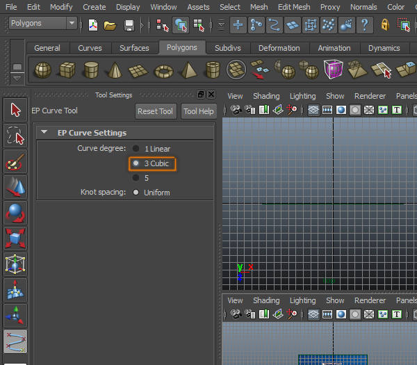 Select the “3 Cubic” option inside the “Tool Settings” window of the “EP Curve Tool”. This will allow us to create a curve with round corners.