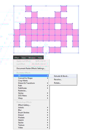 After you’ve finished, just select the space invaders and go to Effect > Apply Extrude & Bevel (Shift-Control-E) to automatically apply the 3D effect with the same options that we’ve set earlier.
